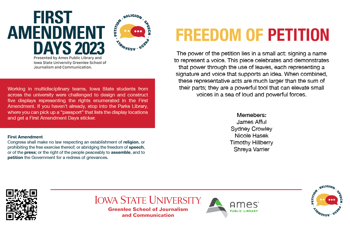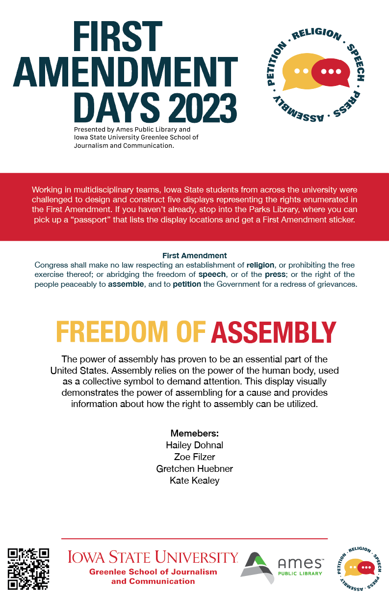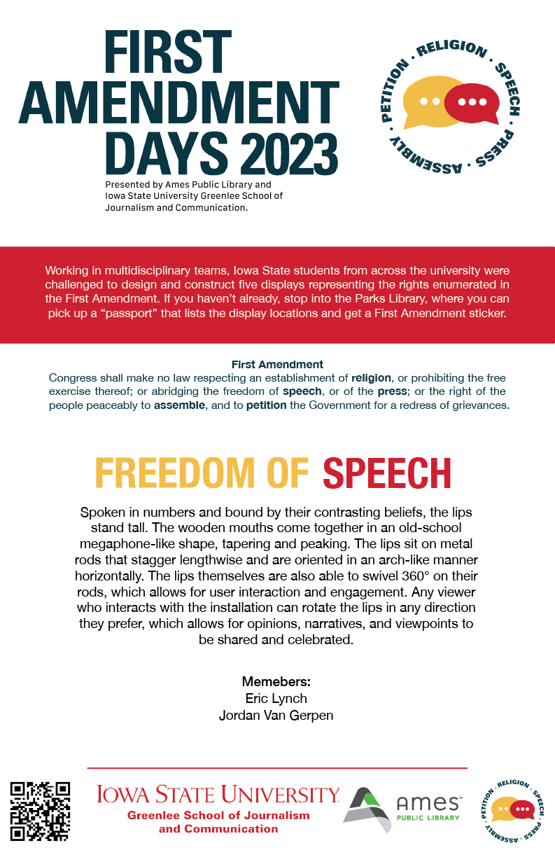 First Amendment Days is an annual event at Iowa State University that brings together students, faculty, and community members to celebrate and reflect on the freedoms of speech, press, petition, assembly, and religion. The organization behind the event is diverse, ranging from its original founders to students experiencing it for the first time.